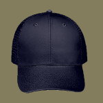 Front: 100% CottonBack: 100% Polyester Mesh Structured Firm Front Panel Low-Fitting 6 panel cap Seamed Front Panel with Full Buckram 6 Sewn Eyelets Matching Visor Edge Color Pro Stitch on Crown 6 Rows Stitching on Visor Matching Fabric Undervisor Matching Color Sweatband Plastic Adjustable Snap Size: OSFM - Adult (58cm/22.8")