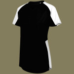 100% polyester wicking knit * Wicks Moisture * Tag-free label * Contrast color neck and sleeves * Raglan sleeves * Fishtail bottom