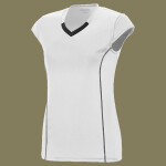 100% polyester wicking smooth knit * Wicks Moisture * Odor resistant * Ladies' fit * Tag-free label * V-neck collar * Contrast color collar and princess seams * Set-in cap sleeves
