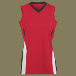 92% polyester/8% spandex wicking pinhole mesh * Wicks moisture * Ladies' fit * Tag-free label * V-neck collar * Contrast color inserts